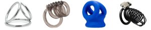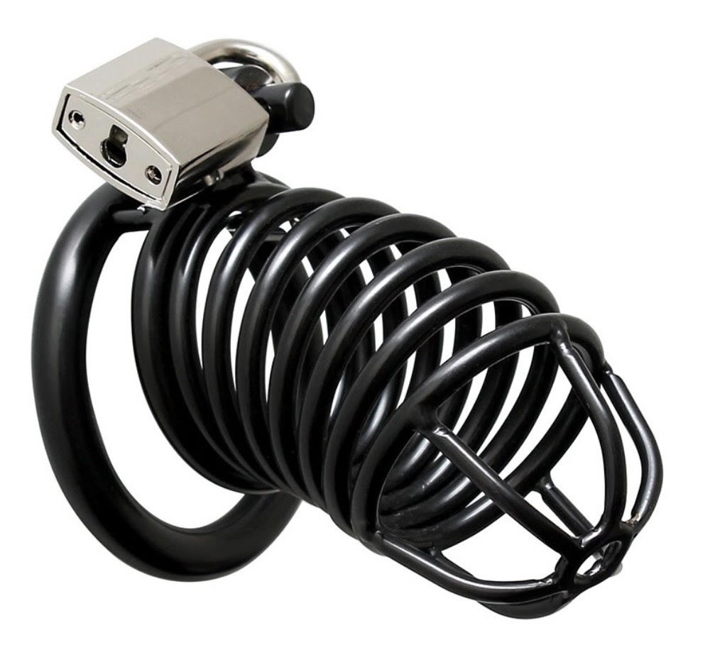 A cock ring that fits behind the balls and a wire cage that encloses and contains the cock.