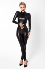 This figure-hugging ensemble is meticulously designed for those who command attention without saying a word. The high-quality, stretch fabric glides over the body, providing a luxurious feel and a flawless appearance. Ingenious with its design, this catsuit boasts a dual zipper system, one discreetly nestled in the crotch and another pair gracing the breasts, allowing for versatile styling and functionality. The waist is adorned with a striking metal ring, a focal point that cinches the silhouette and adds an industrial-chic edge.
