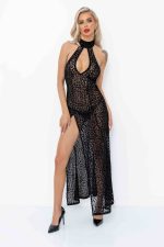 A long and luscious leopard flock dress with high front slit and an open back. Absolutely essential for any woman who wants to feel elegant yet ravishing.