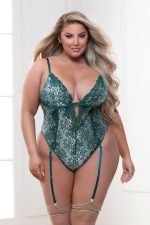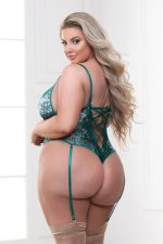 Metallic cross-dye lace teddy with adjustable straps, silver hardware, lace-up back, and removable garters. Stockings not included.