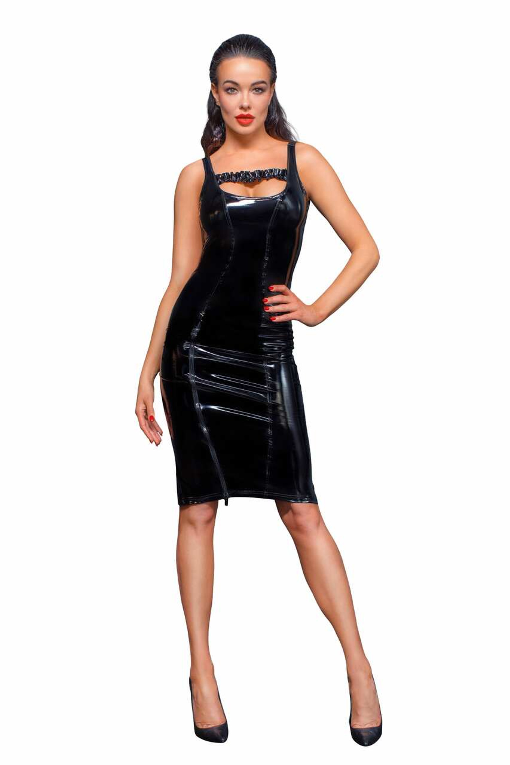 Magnificent PVC midi dress with frilled chest strap and front zipper. The skirt has a high slit up the back to take seduction to a whole new level