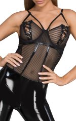 Spice up your life with this overall made of PVC and see-through striped tulle. The bra is decorated with sequin embroidery. PVC straps are adjustable just for your comfort. Tha catusit has easy access zipper and vinyl zipper on the back.