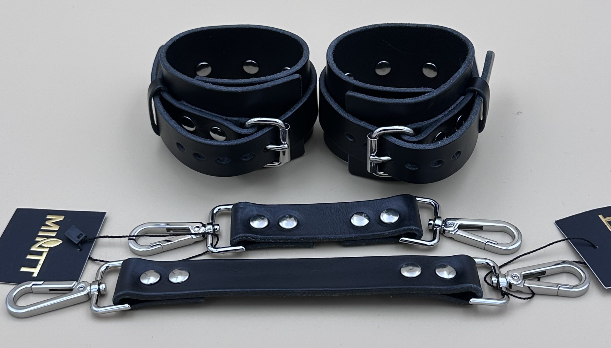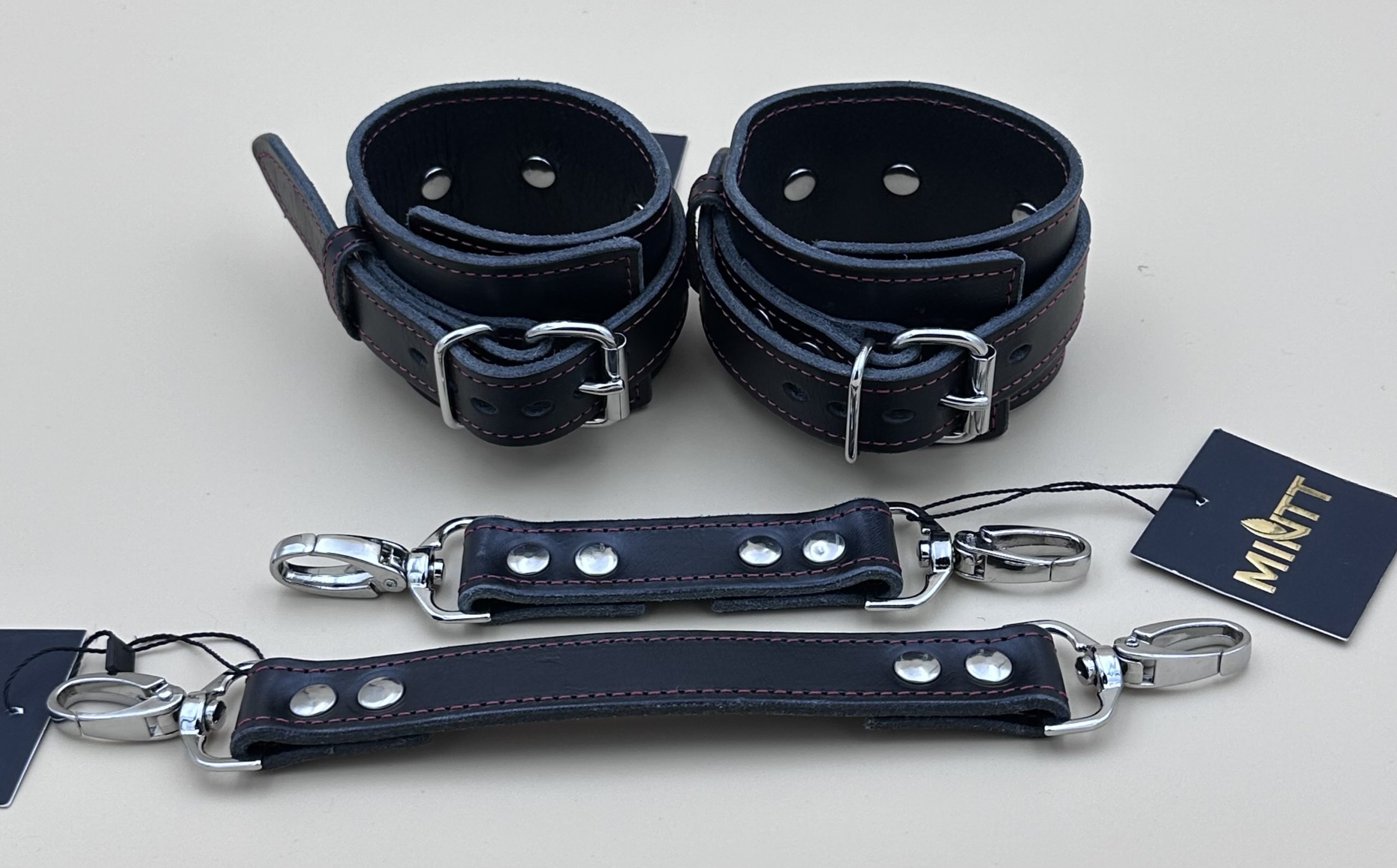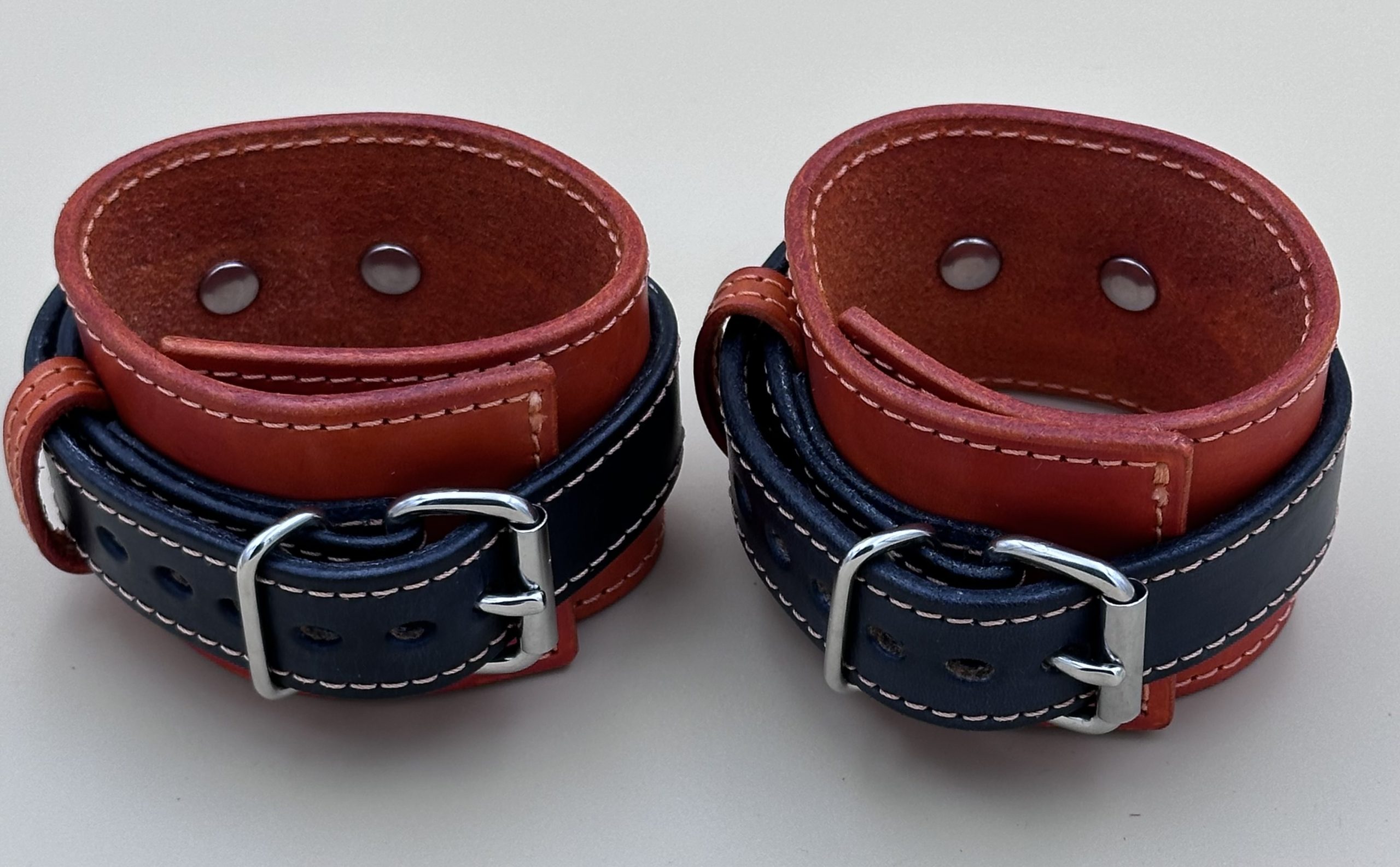 Cobalt Blue Handmade Leather Wrist Cuffs with Black Stitching and Two Couplings