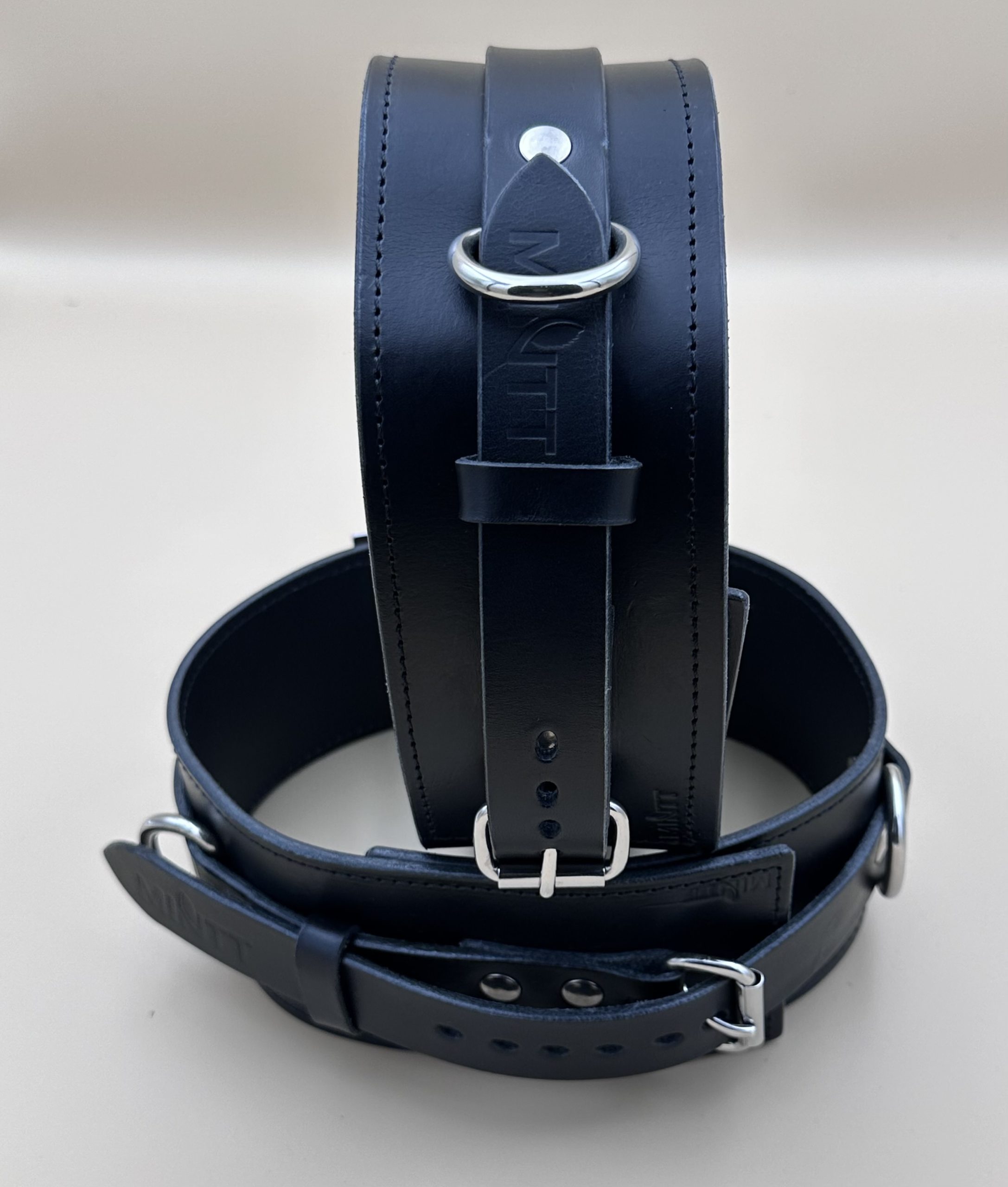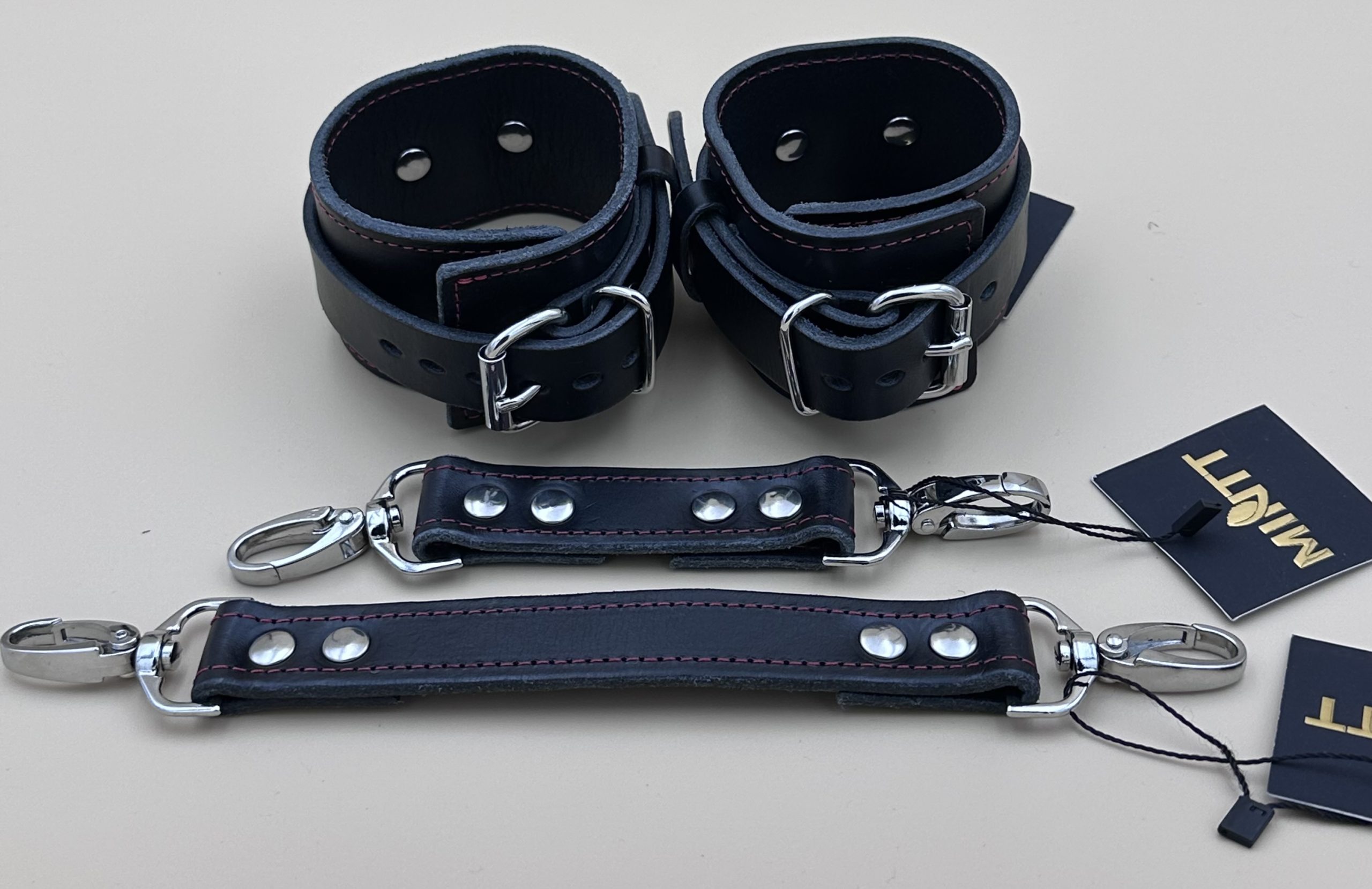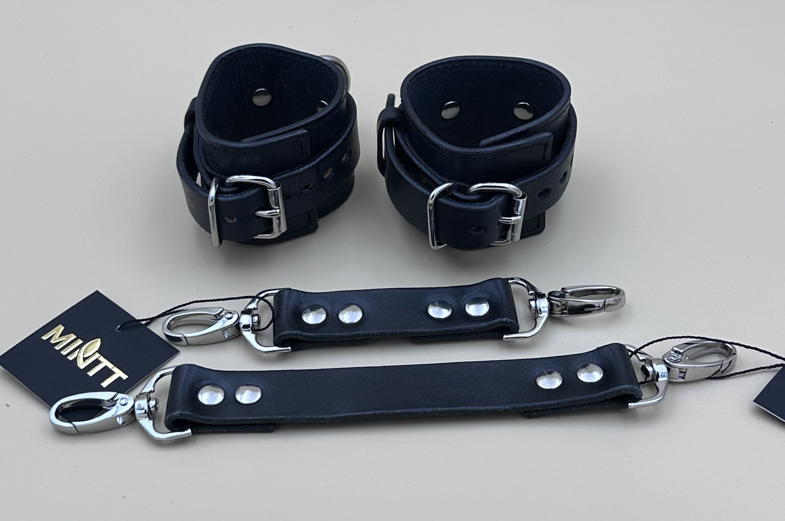 Cobalt Blue Handmade Leather Wrist Cuffs with Black Stitching and Two Couplings