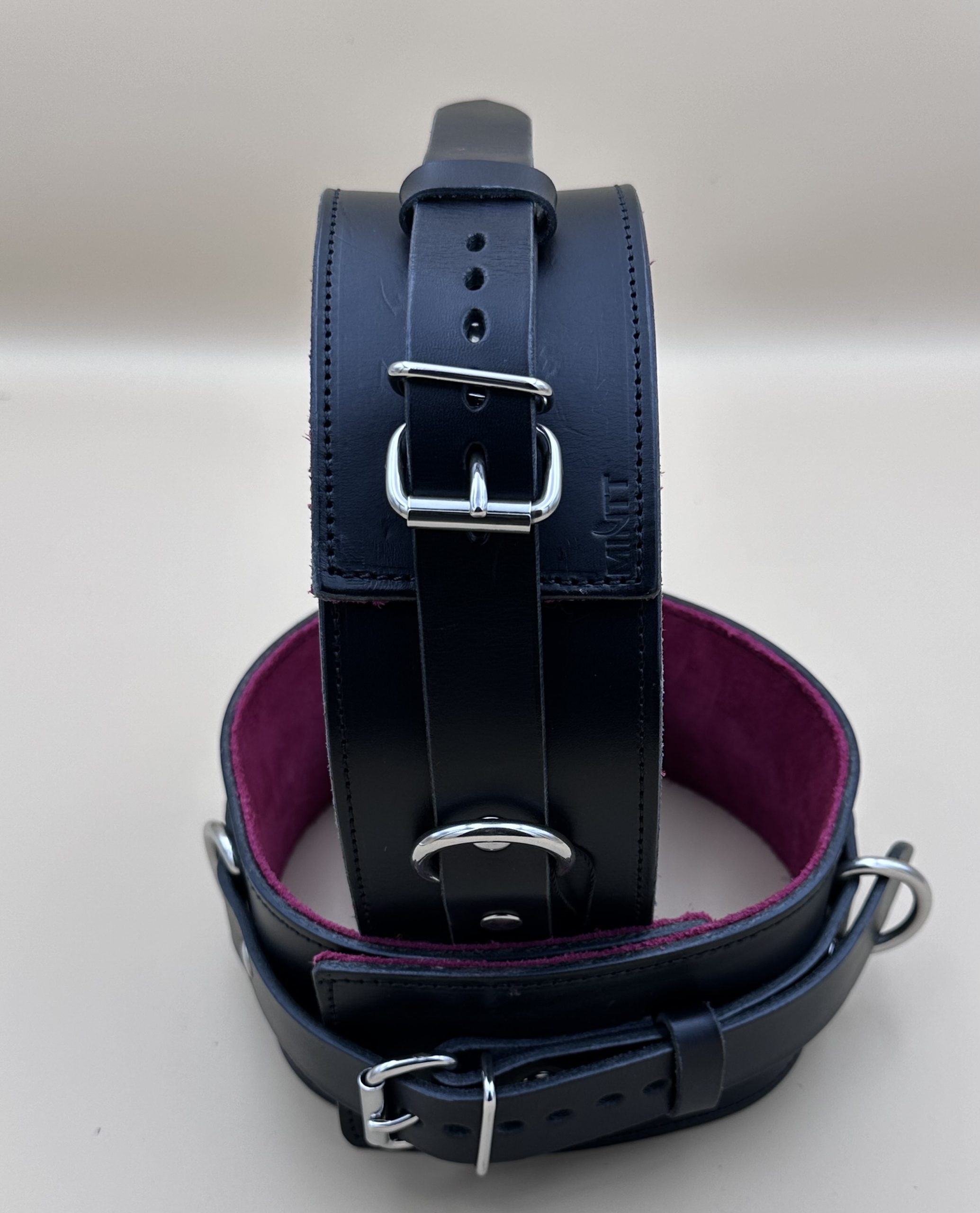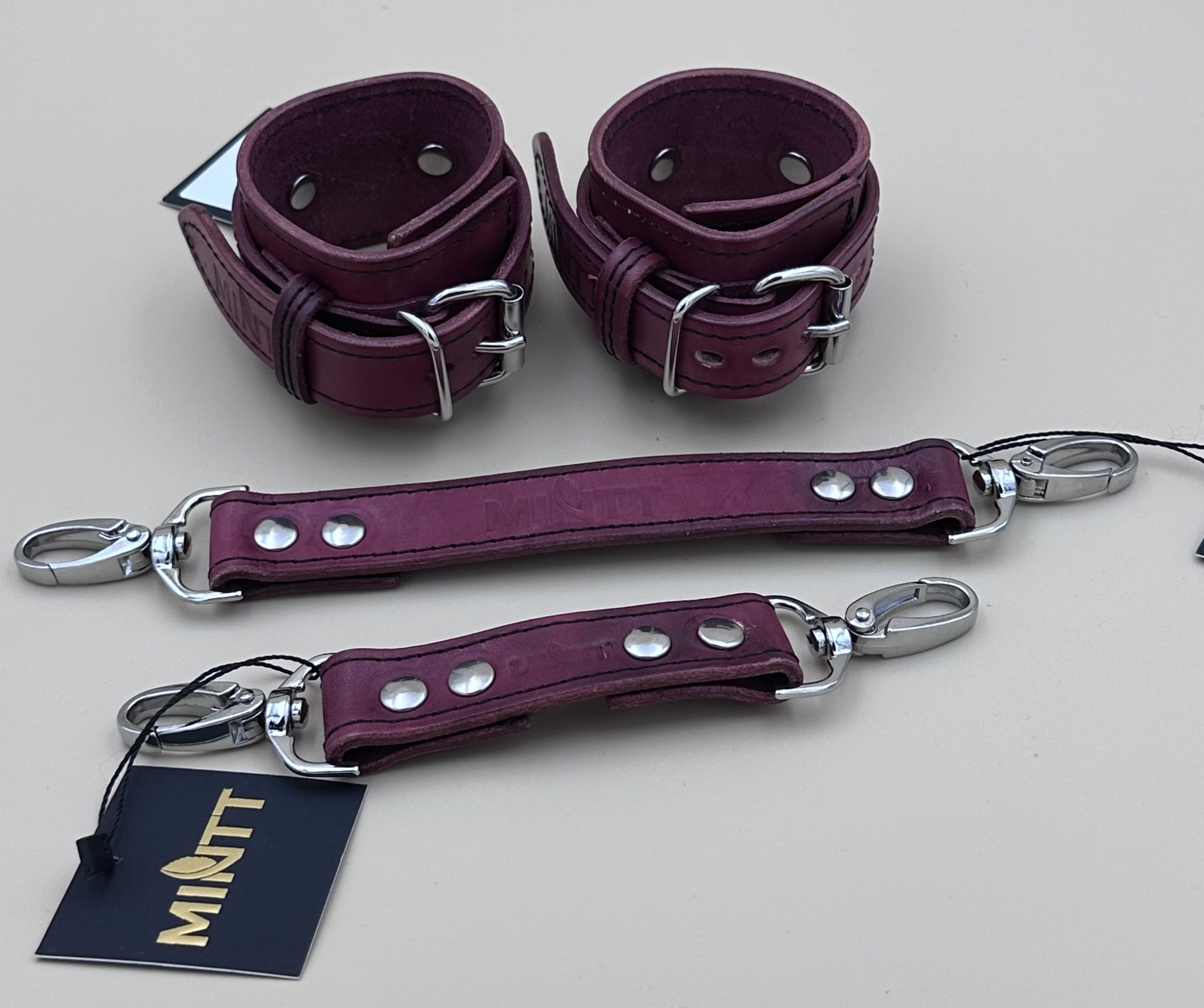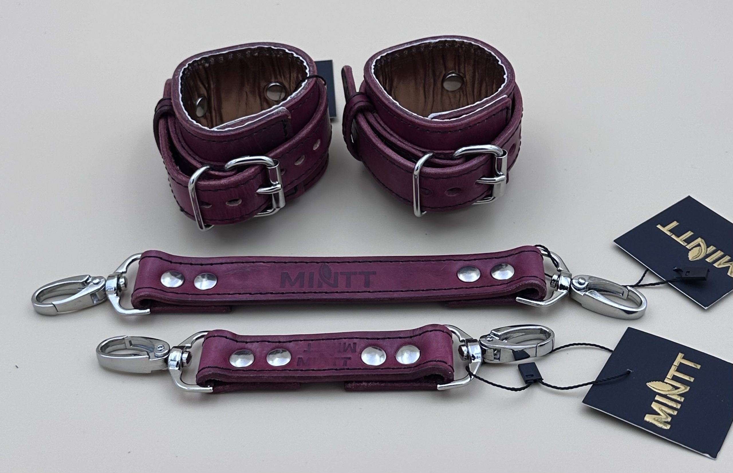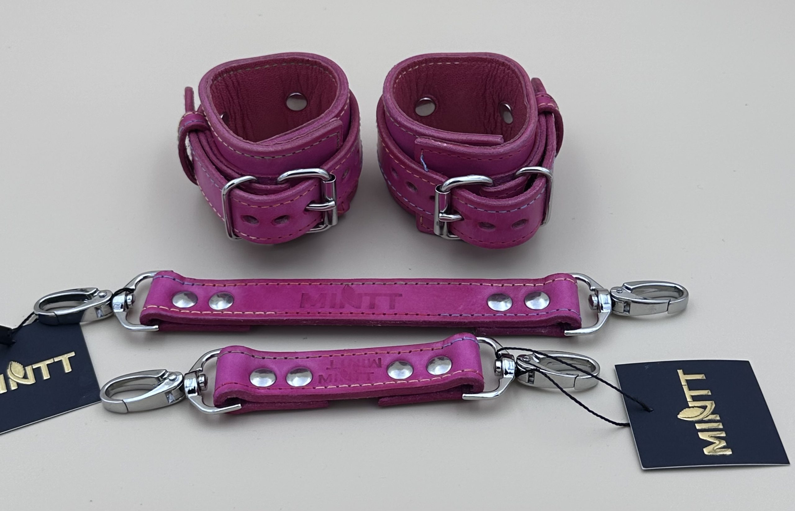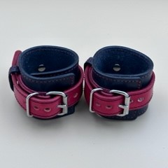 Dark Pink Handmade Leather Wrist Cuffs with Rainbow Stitching and Two Couplings.